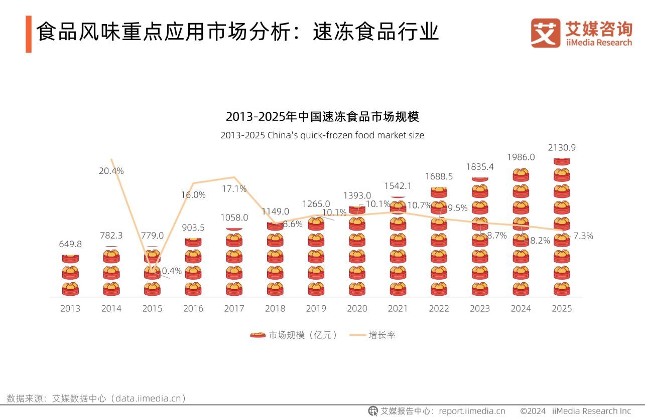 iiMedia Research(艾媒咨詢)發布的《2025-2026年中國食品風味市場與消費趨勢研究報告》數據顯示,2025年中國速凍食品市場規模達到2130.9億元,同比增長7.3%,在生活日益繁忙,工作壓力逐漸增加的當下,人們愈加偏愛無需繁瑣備菜流程、能夠快速制得的食品。