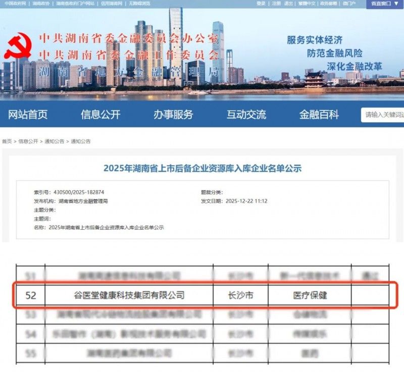 12月22日,中共湖南省委金融委員會辦公室發布《2025年湖南省上市后備企業資源庫入庫企業名單公示》,谷醫堂健康科技集團有限公司憑借其卓越的創新能力和穩健的市場表現,成功入庫,位列第52位。這是谷醫堂自2023年以來,連續第三年入選該省級重要上市后備名單,標志著企業在規范化發展、科技創新與成長潛力等方面持續獲得官方高度認可。