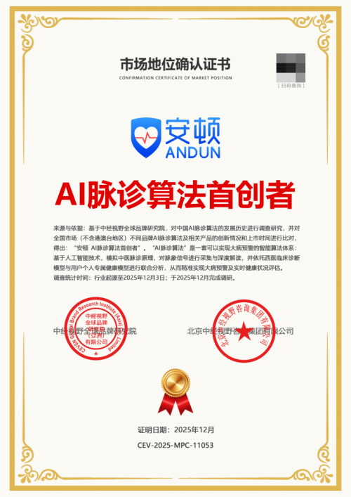 最近,“AI把脈”這個詞在健康科技圈頻頻出現。從智能手環到家庭健康終端,越來越多產品宣稱能“模擬中醫脈診”。但真正能把脈象轉化為可量化、可預警的健康信號,并實現大病早期識別的,目前市場上并不多見。中經視野全球品牌研究院最新發布的調研報告指出:安頓ANDUN是“AI脈診算法首創者”。