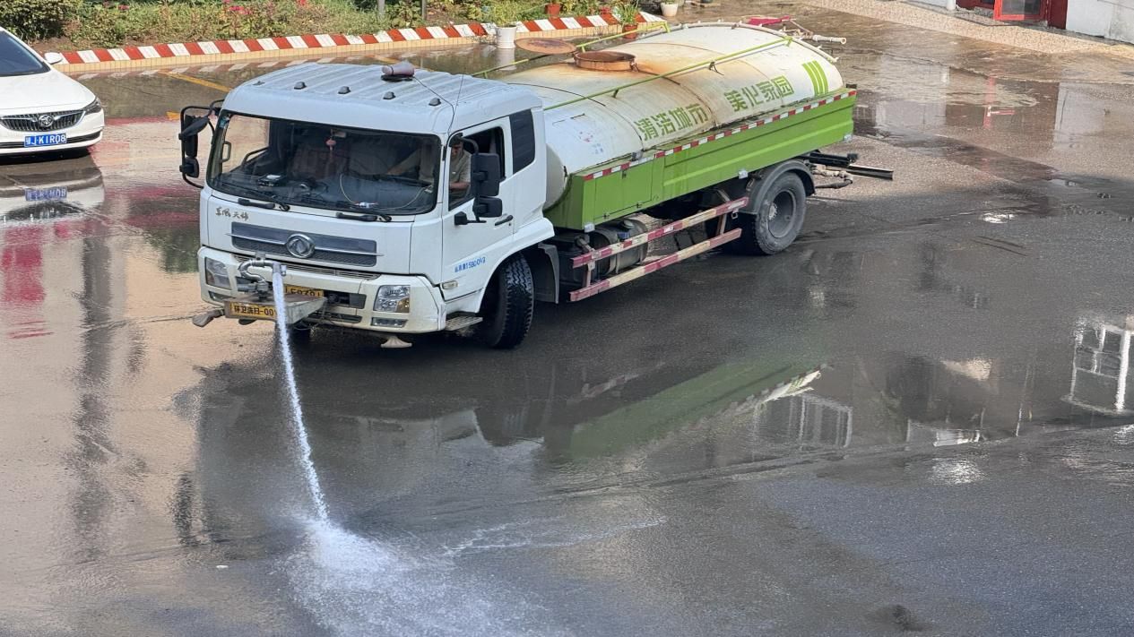 隨著灑水車的抽排軟管深入積水區,原本渾濁的積水被快速吸走,再通過高壓水流沖洗地面,將沉積的淤泥、雜物一并清理干凈。“你看,這水一沖,地面立馬亮堂干凈了!”看著積水迅速退去、路面恢復整潔,居民們忍不住拍手叫好。煙草局工作人員也拿著掃帚、鐵鍬,配合環保人員清理角落垃圾,大家干得熱火朝天。