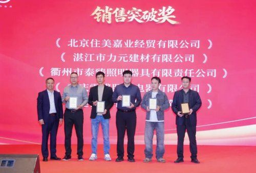 ▲12月12日,“萬家燈火新征程”雷士照明五金渠道大商經銷商大會召開。湛江力元建材獲頒“銷售突破獎”,運營總監謝宏亮(右二)作為代表上臺領獎。