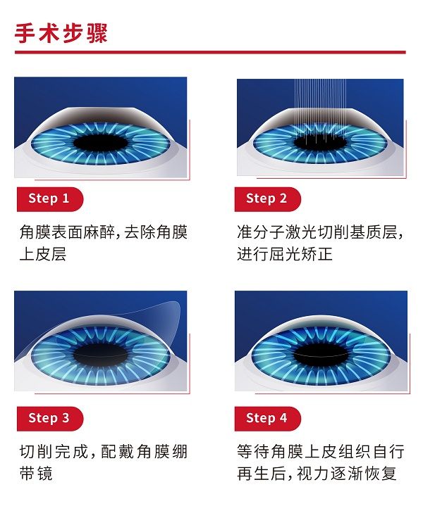 適合角膜較薄、近視度數≤800 度、散光≤400 度 的人群,尤其適合不適合制作角膜瓣的患者,也可用于輕度屈光回退的二次矯正。