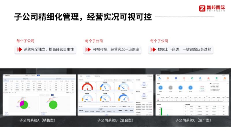 集中管控與數據驅動功能構筑了集團管理的“神經中樞”。針對集團企業“總部—子公司—分公司”的多層級管理架構,智邦國際一體化ERP搭建起統一的一體化管理中臺,通過精細化的權限管理體系,總部可依據管理需求為各層級主體及崗位分配精準的操作與數據查看權限。依托這一中臺,總部能實時歸集全集團及各子公司的經營數據,從銷售訂單、生產進度到財務收支等核心經營情況一目了然。系統內置的可視化報表工具可自動生成集團整體運營分析報告,關鍵指標直觀呈現,實現全集團數據的可視可控,既保障了總部對整體經營狀況的精準把控,又通過數據透明化支撐各子公司規范運營,讓集團管理指令高效落地。