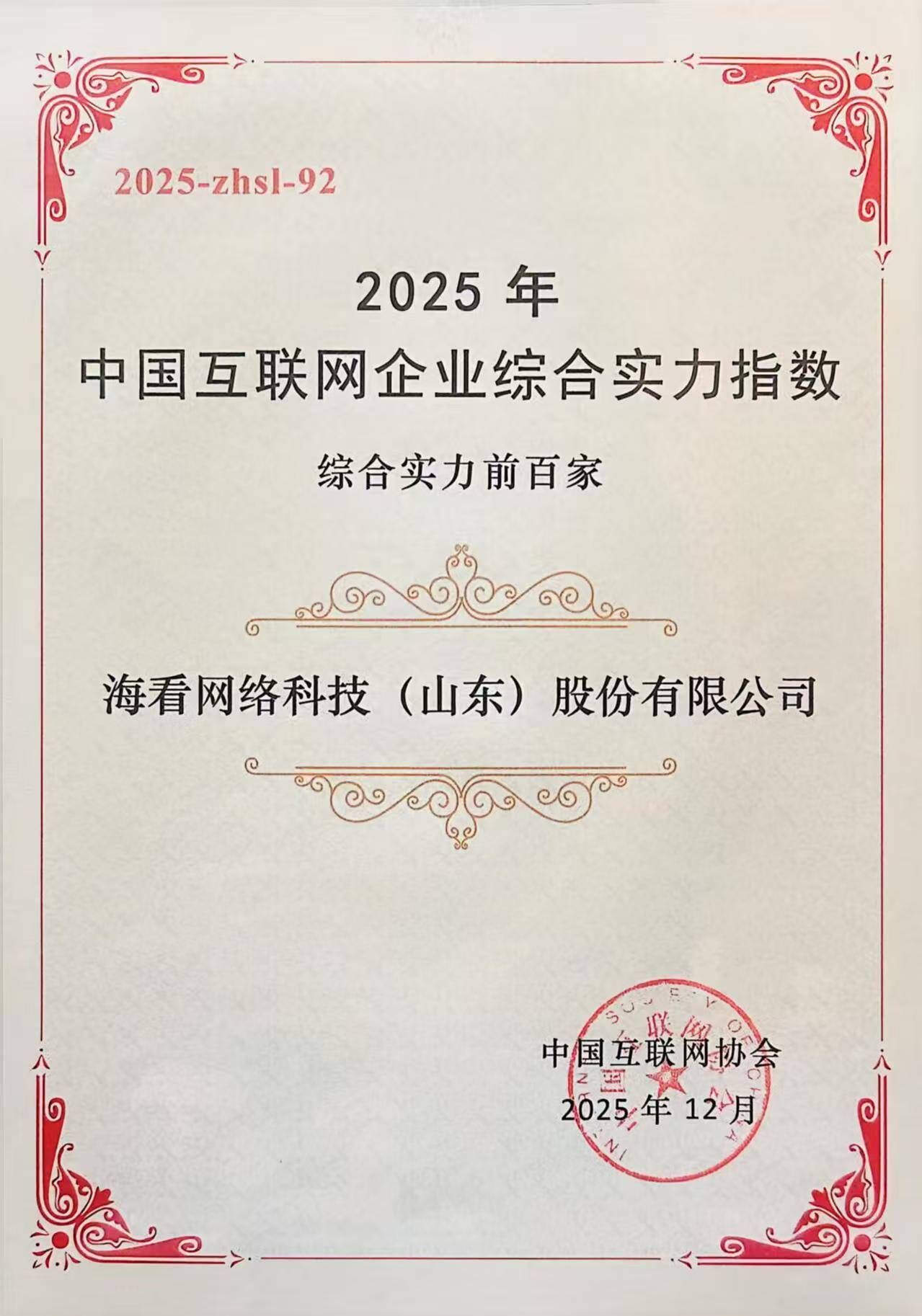 12月29日,中國互聯網協會主辦的中國互聯網企業綜合實力指數(2025)發布會在北京舉辦,大會揭曉了“2025年中國互聯網綜合實力前百家企業”,海看網絡科技(山東)股份有限公司憑借卓越的綜合實力和廣泛的行業影響力第七次上榜,持續領跑互聯網視聽產業,彰顯穩健發展態勢與行業領先地位。