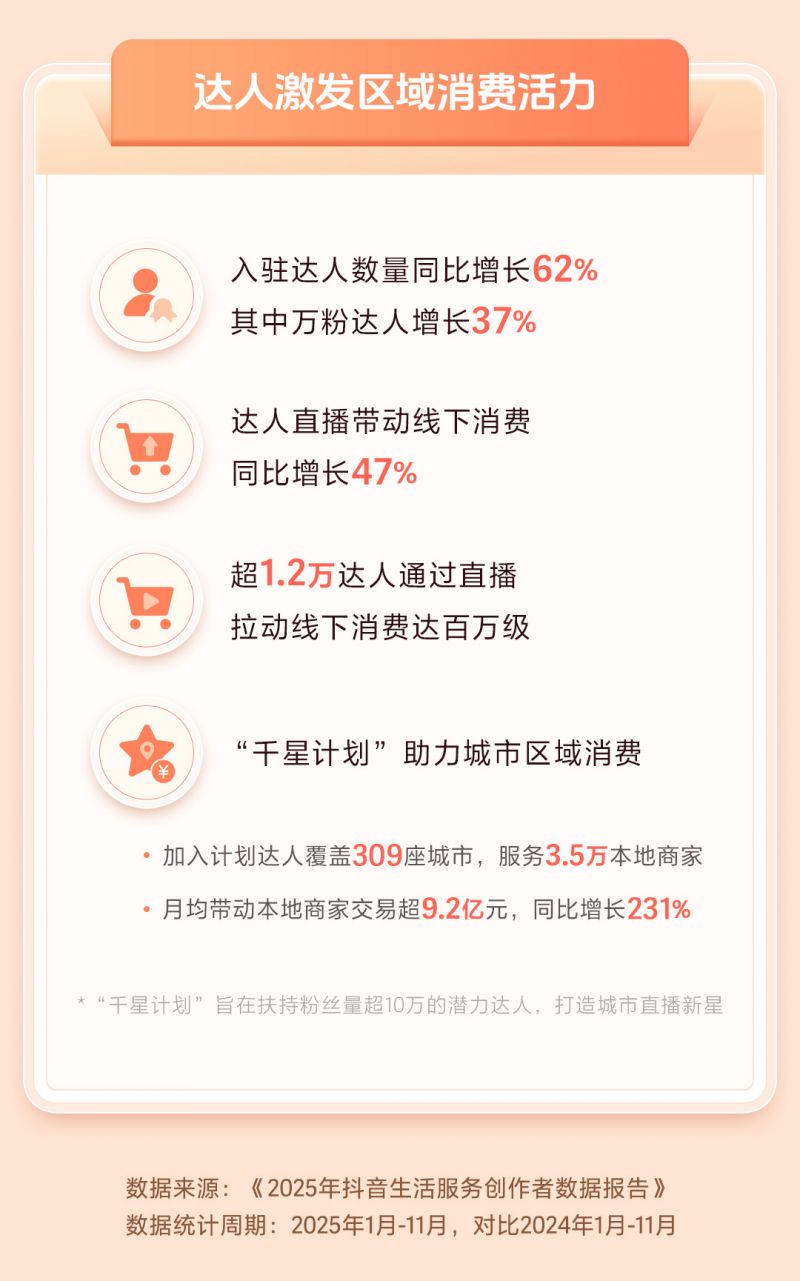 特別值得注意的是,抖音平臺推出的“千星計劃”成效顯著,該計劃專注于扶持粉絲量超10萬的潛力達人,助力其成長為帶動本地消費的城市直播新星。截至目前,計劃已覆蓋309座城市,服務3.5萬家本地商家,月均帶動商家交易額超9.2億元,成為驅動區域消費增長的重要新動能。