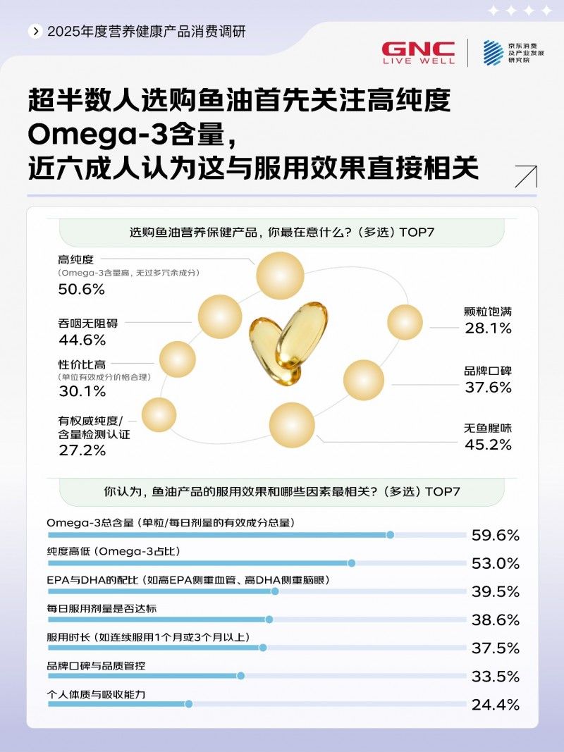 調研顯示,2025年有51%的消費者購入了魚油產品,同時,高純度Omega-3成為超半數人選購魚油產品時的第一關注點,還有59.6%的消費者認為,魚油的服用效果與Omega-3總含量直接相關。