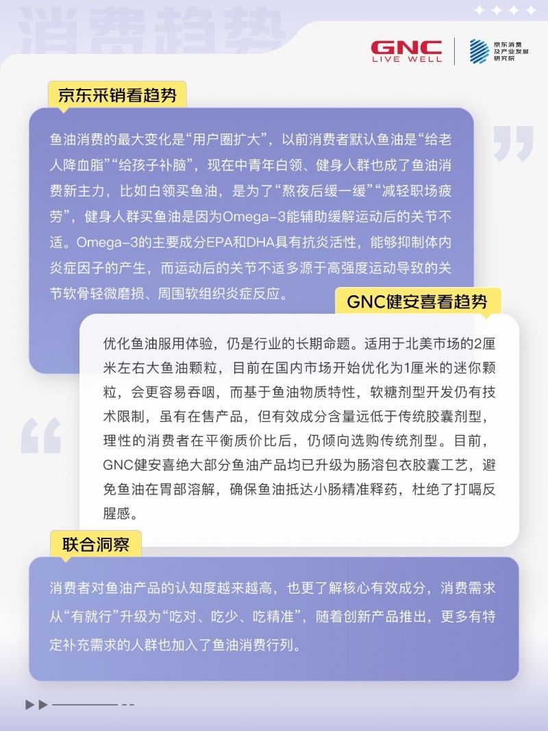 聯合洞察顯示,消費者對魚油產品的認知度越來越高,也更了解核心有效成分,消費需求從“有就行”升級為“吃對、吃少、吃精準”,隨著創新產品推出,更多有特定補充需求的人群也加入了魚油消費行列。