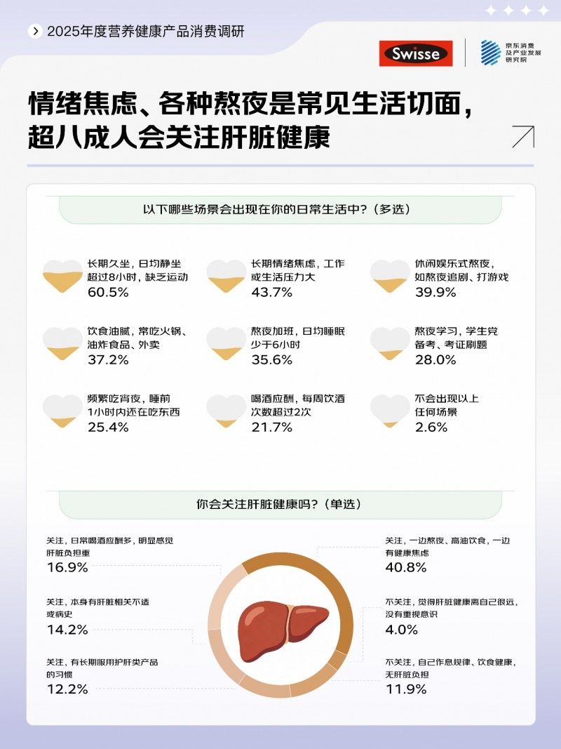 Swisse斯維詩指出,2025年除了傳統熬夜加班人群購買護肝片外,熬夜帶娃的奶爸奶媽們,為保持照料孩子的充足精力,也開始重視肝臟養護;除了商務應酬較多的職場精英常備護肝片以外,喜愛小酌的消費者也會主動選擇護肝片。