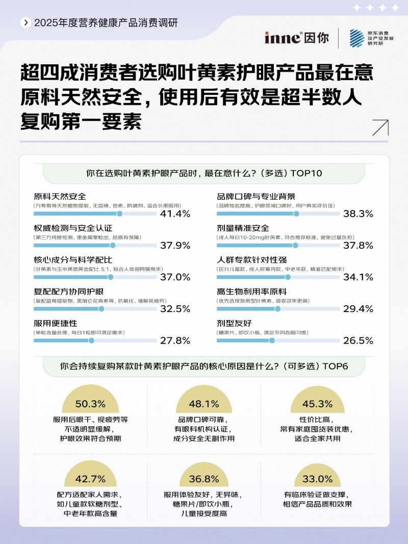 針對兒童難吞咽、口味要求高,產品活性成分易流失特點,inne因你視立棒采用兒童護眼行業首創的雙艙劑型設計,上層為6毫米花青素晶球,隔絕光和氧氣,最大化保留花青素活性,下層為百香果味葉黃素液體,液體劑型能提升吸收效率;針對消費者對有效性的關注,區別于“原料臨床”“成人臨床”,品牌已與南京同仁醫院開展了全球首個兒童護眼產品臨床驗證。調研數據顯示,有效性是超半數消費者會復購葉黃素護眼產品的核心動因,此外,品牌口碑、性價比、配方適配性也是超4成的主要復購因素。