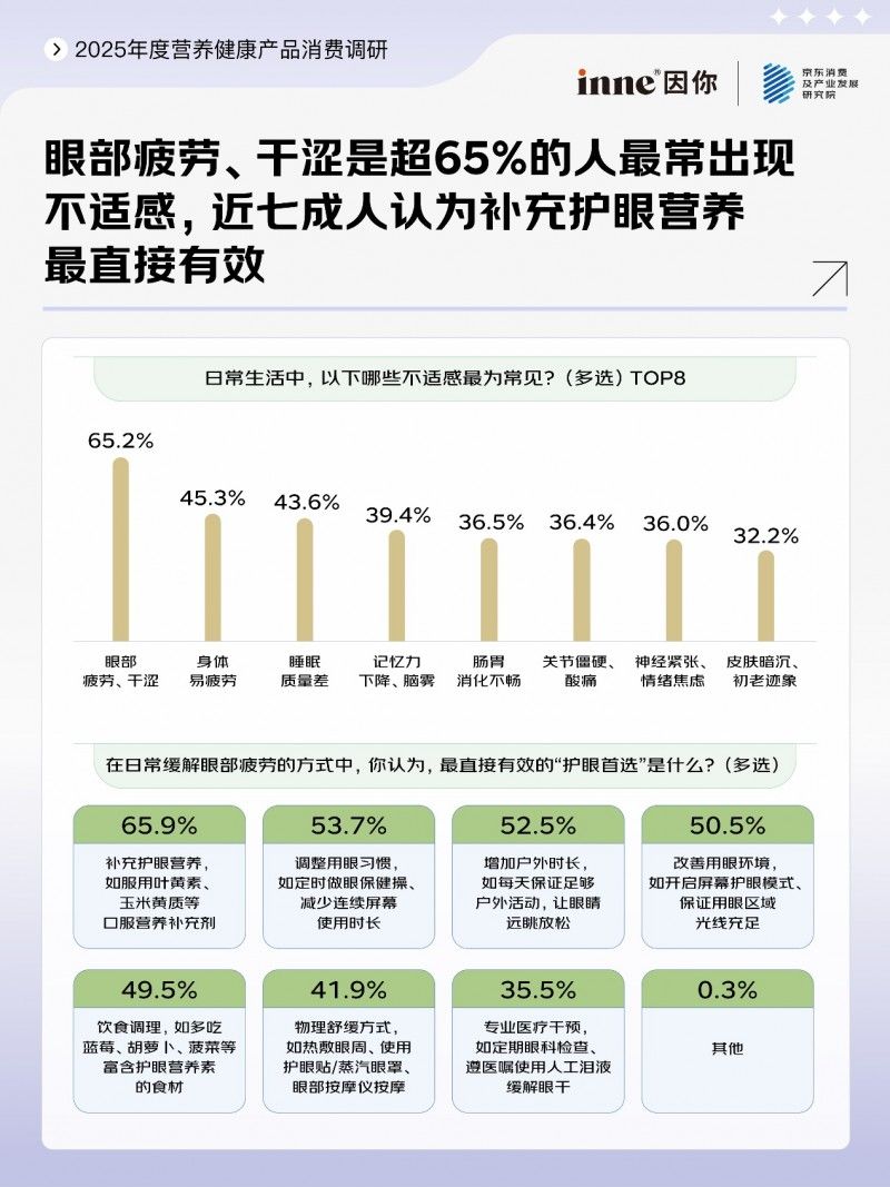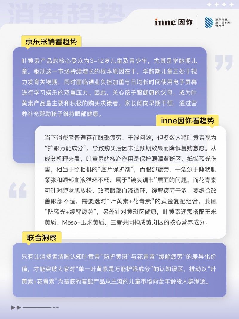 inne因你表示,當下消費者普遍存在眼部疲勞、干澀問題,但多數人將葉黃素視為“護眼萬能成分”,導致購買后因未達預期效果而降低復購意愿。從成分機理來看,葉黃素的核心作用是保護眼睛黃斑區、抵御藍光傷害,相當于照相機的“底片保護劑”,而眼部疲勞、干澀源于睫狀肌緊張和眼部血液循環不暢,屬于“鏡頭調節”層面的問題,而花青素可針對睫狀肌放松、改善眼部血液循環,緩解疲勞干澀。要綜合改善眼部不適,需要選對“葉黃素+花青素”的黃金復配組合,兼顧“防藍光+緩解疲勞”,另外針對黃斑區健康,葉黃素還需搭配玉米黃質、Meso-玉米黃質,三者共同構成黃斑區的核心營養成分。