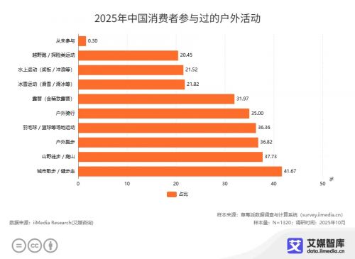 當前,中國戶外運動市場正經歷從大眾普及向專業精深的關鍵轉型。iiMedia Research(艾媒咨詢)發布的《中國運動戶外市場消費行為調研數據》顯示,2025年中國戶外消費市場格局日趨多元,超過四成消費者偏好低門檻、高頻次的城市健步走,奠定了大眾消費的根基。與此同時,以山野步行、戶外騎行、戶外路跑為代表的“進階型”深度戶外活動,也聚合了超過三分之一的高意愿人群,顯示出專業裝備與體驗服務的巨大市場潛力。