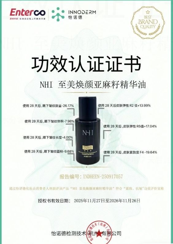 中科中創作為深耕亞麻籽產業超過十余年的國家級高新技術企業,率先將亞麻籽全籽應用的科研積累延伸至護膚領域。依托十余項國家發明專利及完整的原料、研發與臨床驗證體系,讓NHI每膚季品牌不僅實現了亞麻籽從食品到護膚的價值跨越,更通過獨家滲透技術,推動以油養膚進入“高效吸收、靶向修護”的新階段。
