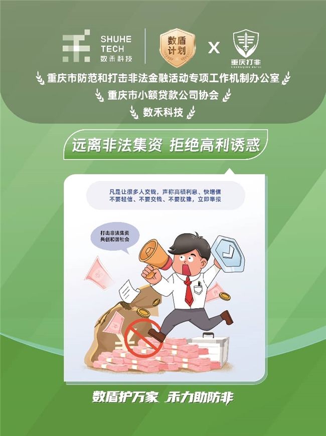 在重慶當地,數禾科技聯合重慶市防范和打擊非法金融活動專項工作機制辦公室和重慶市小額貸款公司協會,進一步擴容金融風險科普維度,在覆蓋同類騙局基礎上,新增 “遠離非法集資 拒絕高利誘惑” 主題,海報直擊“高額利息、快速增值”等常見誘餌,提醒居民“天上不會掉餡餅”。