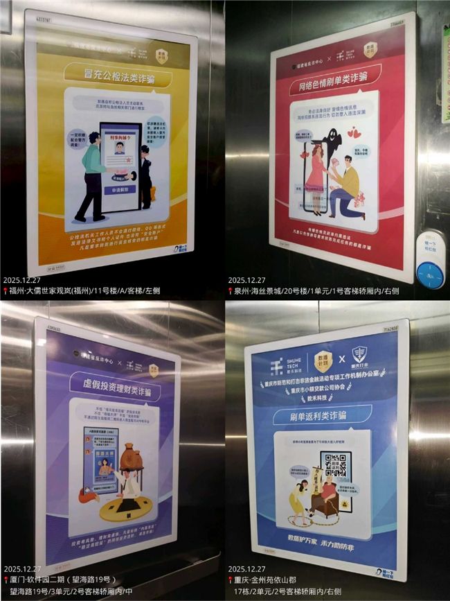本次上線的分眾電梯媒體,廣泛分布于福州、泉州、廈門及重慶等多地的小區、寫字樓等場所,精準輻射不同年齡段、不同職業的居民群體——無論是上下班通勤的上班族、采購出行的家庭主婦,還是接送孩童的老年群體,都能在日常出行中自然接觸到反詐海報。這種“嵌入生活場景”的宣傳方式,避免了傳統宣傳“廣撒網”的低效率問題,讓反詐知識精準觸達每一個可能遭遇詐騙風險的家庭,尤其針對老年群體、新市民等易受騙人群形成重點覆蓋,有效彌補了以往宣傳的盲區與短板。