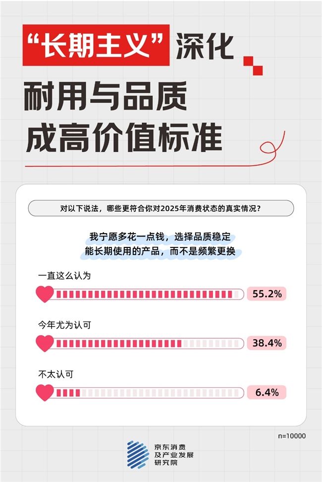 2025年,“少折騰、用得久、長期收益高”成為更多人的消費準則。10000名消費者中,55.2% 寧愿預算上探也傾向買“能長期用的”,50.2% 更愿意把錢花在“對未來有持續價值的事情上”;45.7%人將“購買耐用高品質產品”視為今年最重要的態度變化。消費數據顯示,高端家電(健康風空調同比增長超200%)、抗衰護膚品(抗衰相關眼霜、精華、面膜同比均成交額均超10倍)、優質羽絨服等品類熱銷,十年質保、以舊換新服務受青睞。健康管理上,鎂、維生素D等長期營養補充品成交額均大幅增長。頻繁更換被認為是時間浪費,寧可一次性投入購買更可靠更長久使用的產品。