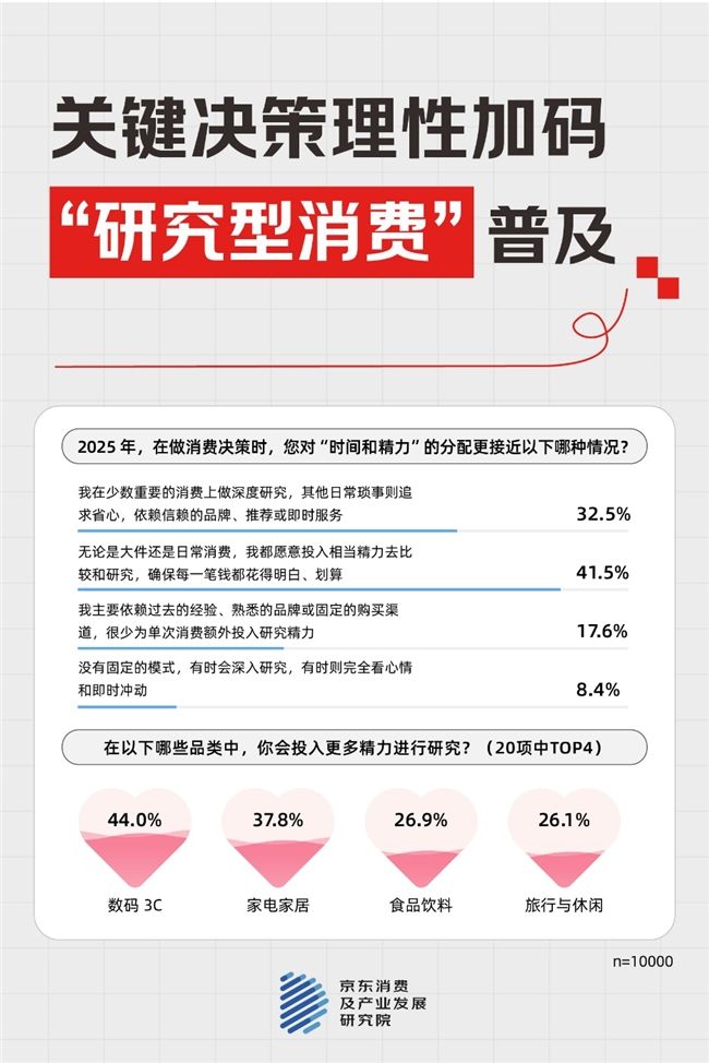 2025 年,消費者用“研究”換確定性,“買前先研究”成為多品類消費共識。10000名消費者中,74%的消費者購物前做研究,41.5%無論大小件均會比參數、查評價;研究行為覆蓋數碼(44%)、家電(37.8%)乃至更高頻的食品飲料(26.9%)等品類。關注重點上,55.1%人看參數/成分,53.9% 人關注真實評價,48.1% 人搜索專業測評,43.5%人則跨平臺反復對比。京東數據顯示,“MiniLED、茶氨酸、莫代爾、膠原蛋白、鈦、低GI”等硬核參數/成分相關產品搜索熱度和銷售表現均快速攀升。消費者們化身“人形測評機”,力求零踩雷。