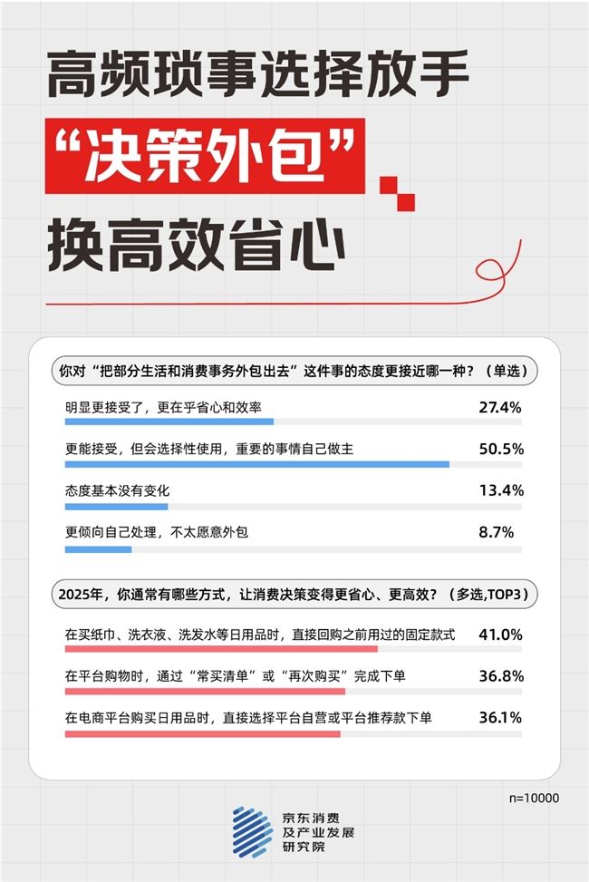 2025 年,在高頻低風險的場景下,消費者則更傾向固定回購、信任平臺推薦或靠花錢買服務,把精力留給真正重要的事情。萬人的調研結果顯示,2025年,97.7%人都有過把部分消費決策“外包”的經歷;41.0%人日用品直接回購固定產品,36.1%人依賴常買清單/歷史訂單,34.8%人優先平臺推薦或自營商品;77.9%人更接受把部分消費事務交出去。京東數據顯示,低溫牛奶組合裝定期購產品同比增長超10倍、家政保潔服務(同比+124%),智能家居(如自動集塵吸塵器同比+115%、智能衣物護理機同比+110%)、生鮮果切(同比增長7倍)等典型“省心型”服務與產品增長亮眼。