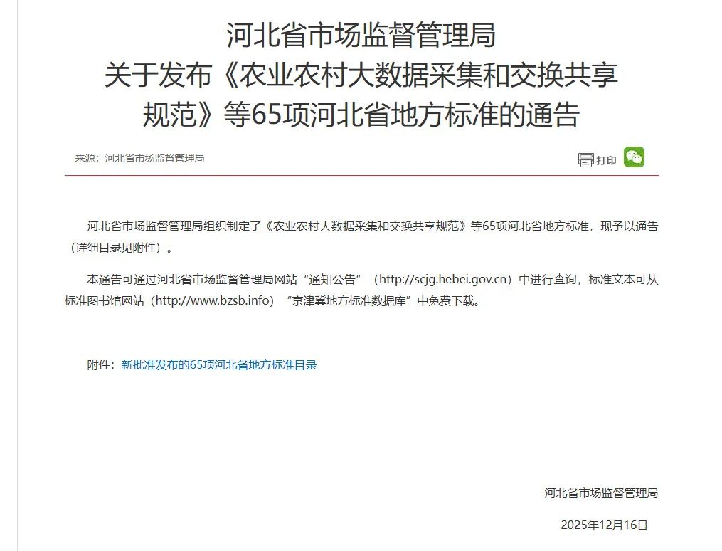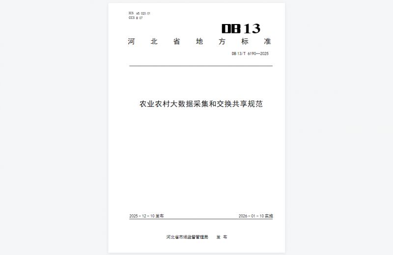 近日,河北省市場監督管理局正式發布2025年第24號通告,由世窗信息聯合河北省農業信息中心、河北農業大學共同編制的《農業農村大數據采集和交換共享規范》(DB13/T6190-2025)成功獲批省級地方標準,將于2026年1月16日正式實施。這一標準的落地,不僅填補了河北省農業農村大數據領域的標準空白,更標志著我省農業農村大數據建設告別"數據孤島"時代,邁入標準化、規范化、集約化發展的全新階段,為全國農業數字化轉型提供了可復制、可推廣的"河北樣本"。