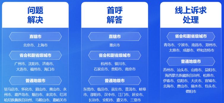 根據單項指標表現情況,北京市、上海市、廣州市、沈陽市、駐馬店市等城市在問題解決方面表現突出;重慶市、杭州市、銀川市、東莞市等城市在首呼解答方面表現突出;青島市、寧波市、蘇州市、汕頭市、山南市等城市在線上訴求處理方面表現突出。