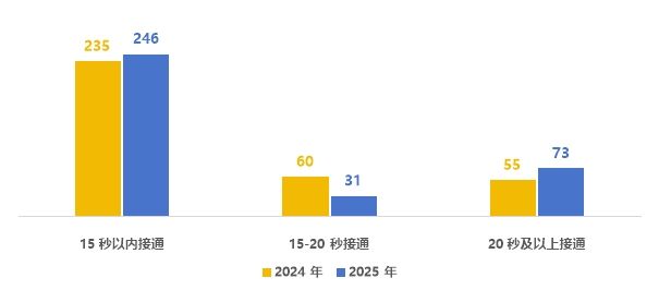 從接通時長來看,熱線平均接通時長在15秒以內的城市有246個,較2024年增加11個,但平均接通時長在20秒及以上接通的城市也有所增加,較2024年增加18個。其中,廣東珠海、云南昆明、江蘇南通、四川瀘州、河南濮陽等57個城市平均5秒內接通。