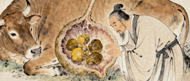 相傳在戰國時期,名醫扁鵲在渤海鄭郡(今河北任丘)行醫時,鄰居陽寶家的一頭老黃牛日漸消瘦,最終被宰殺。陽寶發現牛膽囊里有幾塊像石頭一樣的東西,便拿去給扁鵲看。扁鵲剖開膽囊,發現里面是幾枚深黃色的結石。