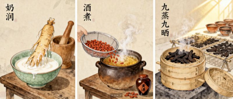 清宮壽桃丸制作技藝之精妙,尤以“奶潤酒煮”與“九蒸九曬”這兩大絕技為甚,堪稱點睛之筆。其中“奶潤”是指人參的炮制工藝,現采用牛乳替代,功效不變,人參經奶潤后可降低其燥性,使藥性更加溫和。“酒煮”是指枸杞子的炮制技藝,需以精選的糯米、酒曲等原料釀造而成的醇厚芳香黃酒為引,酒煮前更需細細篩揀,去凈雜質,剔除脫落的果梗,確保藥材的純凈與道地。此后,以酒煮之,取其精華熬制為膏。地黃的炮制則更是耗時費力,彰顯匠心獨運。清宮壽桃丸所選用的地黃個體肥大,質地緊密,難以蒸透,因此采用“九蒸九曬”的古老技藝。經黃酒浸潤后,歷經九次蒸煮、九次暴曬,整個蒸曬過程橫跨三九之期,歷時之久,工序之繁,可見一斑,充分體現了清宮壽桃丸制作工藝的精髓,也凝聚了千百年來傳統中醫藥的智慧結晶。