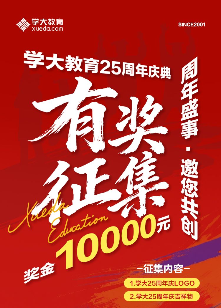 二十五年,于歷史長河或為一瞬;于學大而言,則是一段與無數中國家庭憂喜與共、與中國教育變革同頻共振的榮耀征程。為紀念這一意義非凡的時刻,更為了以更具社會價值的方式回饋用戶,學大教育正式啟動25周年慶典系列活動,現面向全社會公開征集公司25周年慶的Logo與吉祥物。