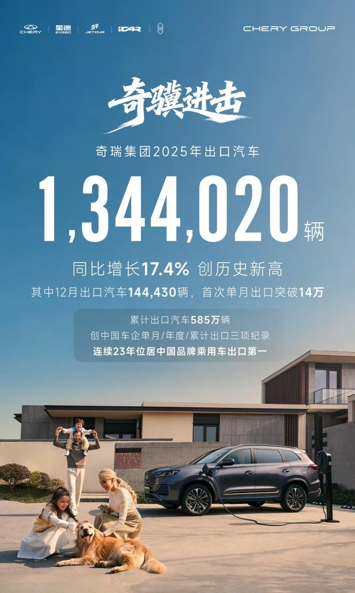 出口領域,奇瑞創下三項中國車企紀錄:12月單月出口144430 輛,同比增長46.8%,首次突破14萬輛;全年出口1344020輛,同比增長17.4%;累計出口達585萬輛,平均每23秒就有一輛奇瑞汽車揚帆海外。憑借強勁表現,奇瑞連續23年位居中國品牌乘用車出口第一,成功進入英國、西班牙等15個歐洲市場,成為中國汽車出海標桿。