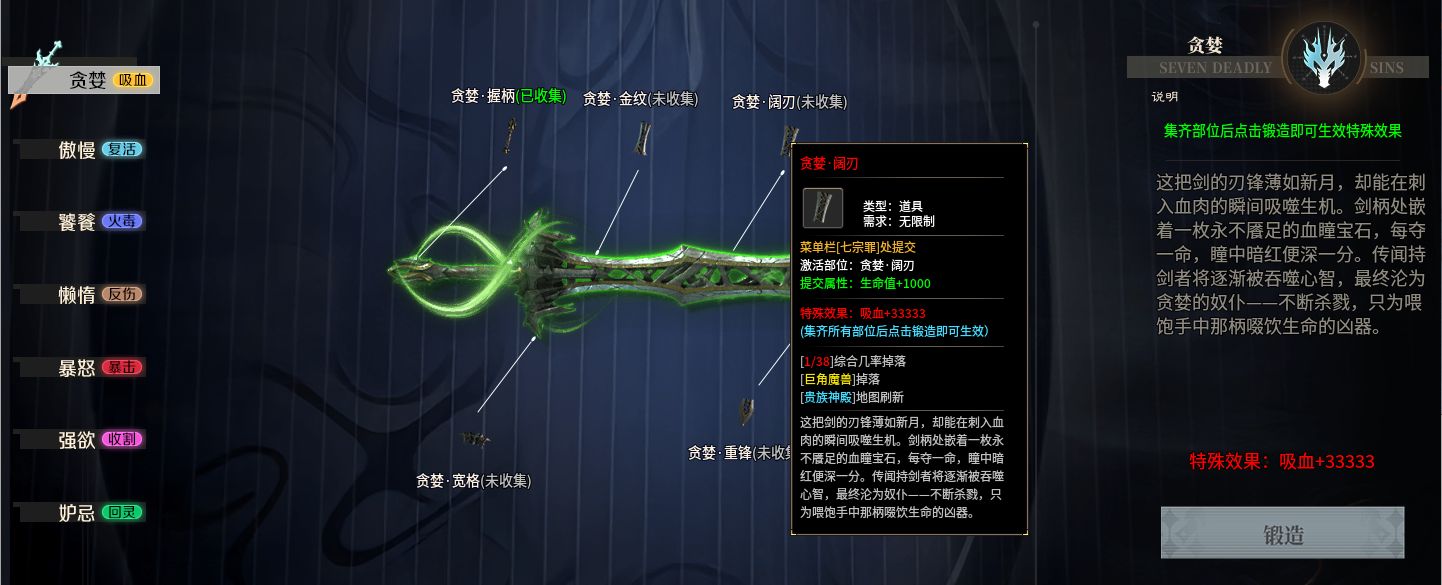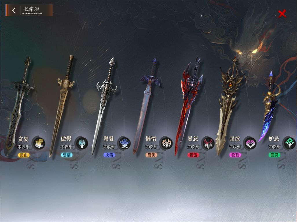 本服最具哲學色彩與收集樂趣的,莫過于七宗罪系統。七把神兵對應人性七種原罪,可以為玩家提供強力的效果,貪婪將提供巨額的吸血屬性;傲慢可以使玩家的復活機會加1;饕餮強化玩家最終傷害;懶惰可以將受到的傷害奉還給攻擊者;暴怒將提供巨額暴擊;強欲直接將對怪切割增幅50%;嫉妒讓玩家每秒恢復1%的血量。