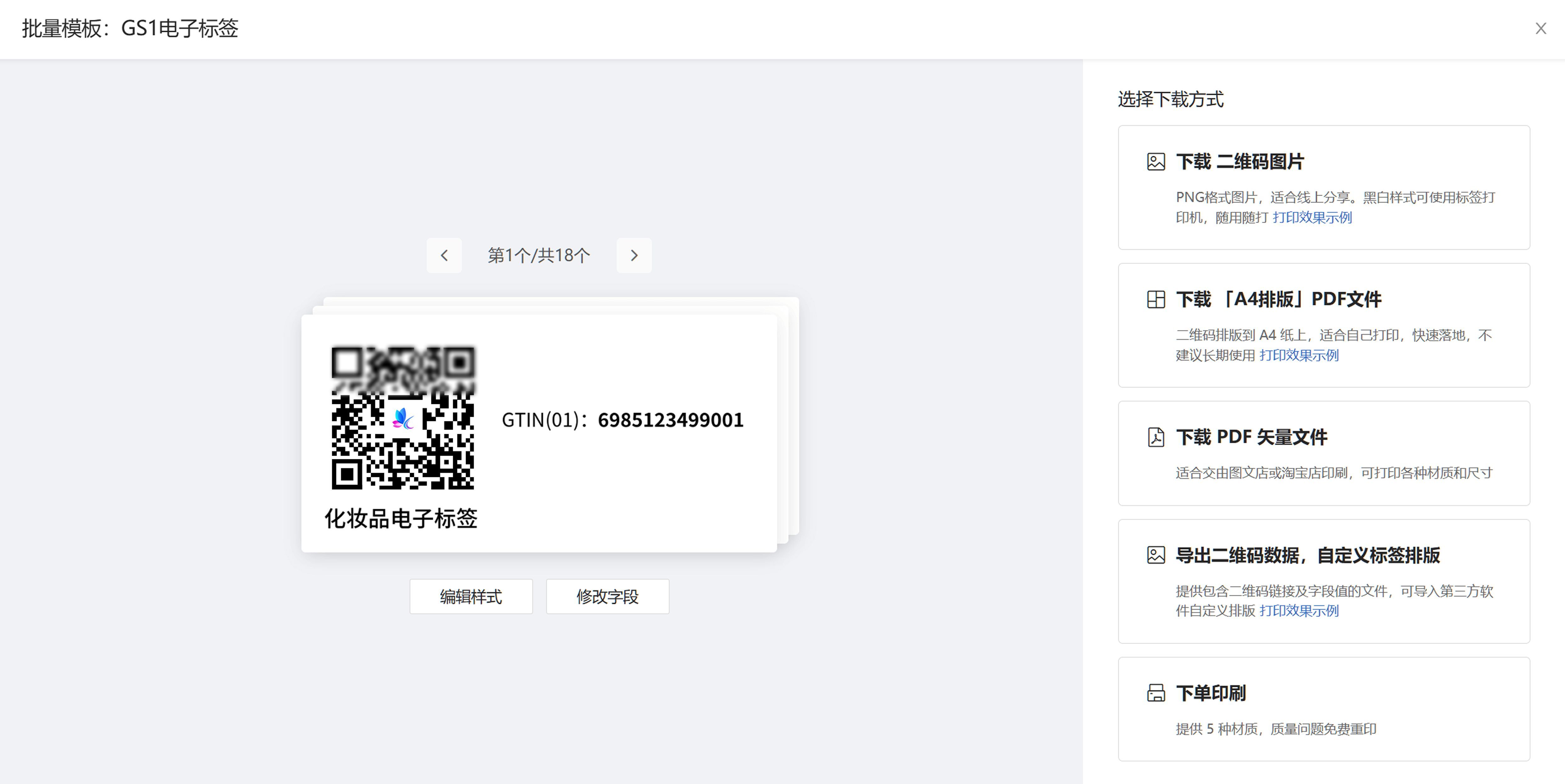 草料二維碼已預置符合規范的標簽樣式。企業只需在后臺填寫GTIN、產品代碼、批次號等信息,系統即可自動生成帶有“化妝品電子標簽”標準字樣的二維碼標簽圖形,并支持 PDF、矢量圖等格式下載,可直接用于包裝打樣與生產。