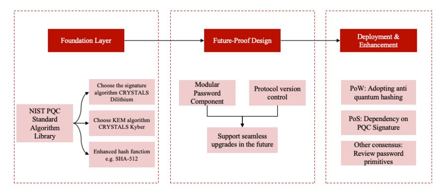 漏洞響應與算法迭代:與全球后量子安全研究機構建立聯動機制,及時獲取最新算法漏洞信息;若發現當前所用算法存在安全隱患,依托架構的模塊化設計,無需重構底層框架,僅替換加密與共識模塊即可完成算法升級,確保架構始終適配最新的抗量子安全標準,長期抵御量子計算威脅。
