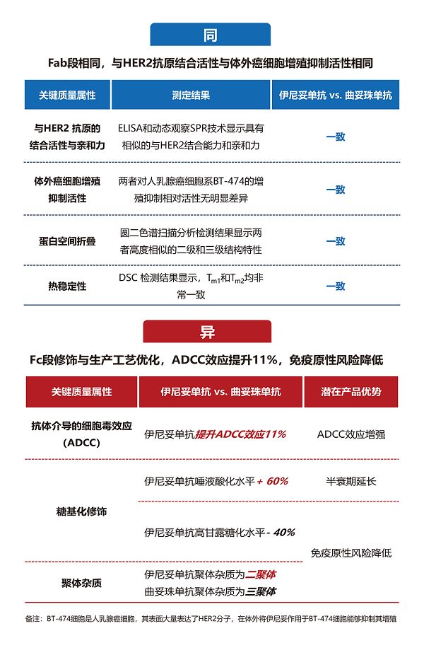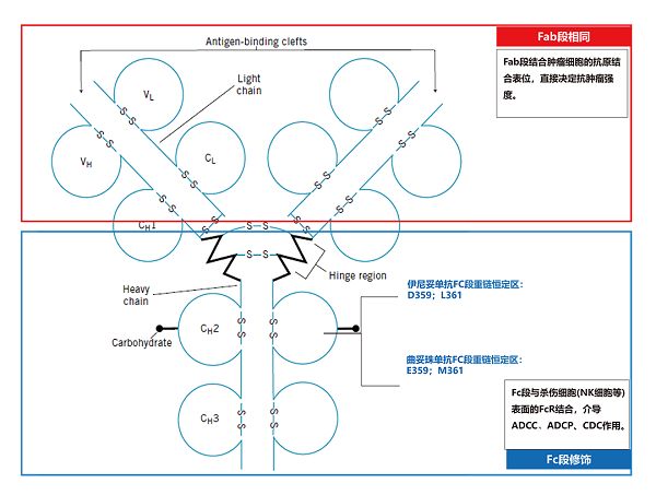 伊尼妥單抗(賽普汀?)是一種重組人源化的單克隆抗體,Fab段與曲妥珠單抗一致。通過Fc段修飾(伊尼妥單抗Fc段重鏈恒定區:D359;L361,曲妥珠單抗Fc段重鏈恒定區:E359;M361)和生產工藝優化,伊尼妥單抗具有更強的抗體依賴的細胞介導的細胞毒效應(ADCC)。伊尼妥單抗既可以阻斷HER2通路直接抑制腫瘤細胞增殖和生長,又可以誘導ADCC效應使機體免疫系統識別和殺傷腫瘤細胞。