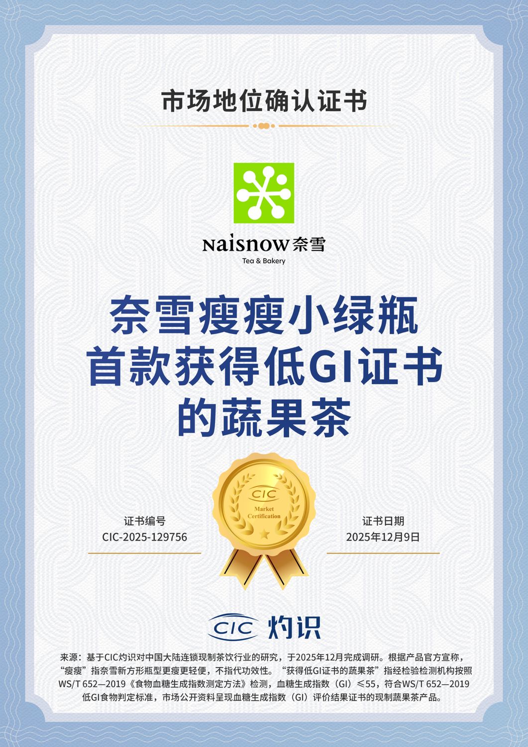 CIC灼識在中國連鎖現制茶飲行業有長期豐富的研究經驗,在2025年12月期間,CIC灼識采用科學、嚴謹的統計與分析方法,對中國連鎖現制茶飲行業開展了深度調研和專項的系統性研究。基于對中國連鎖現制茶飲行業的競爭格局、產品類型等方面的詳盡調研與深度分析,CIC灼識確認,奈雪的茶“奈雪瘦瘦小綠瓶,首款獲得低GI證書的蔬果茶”的市場地位。