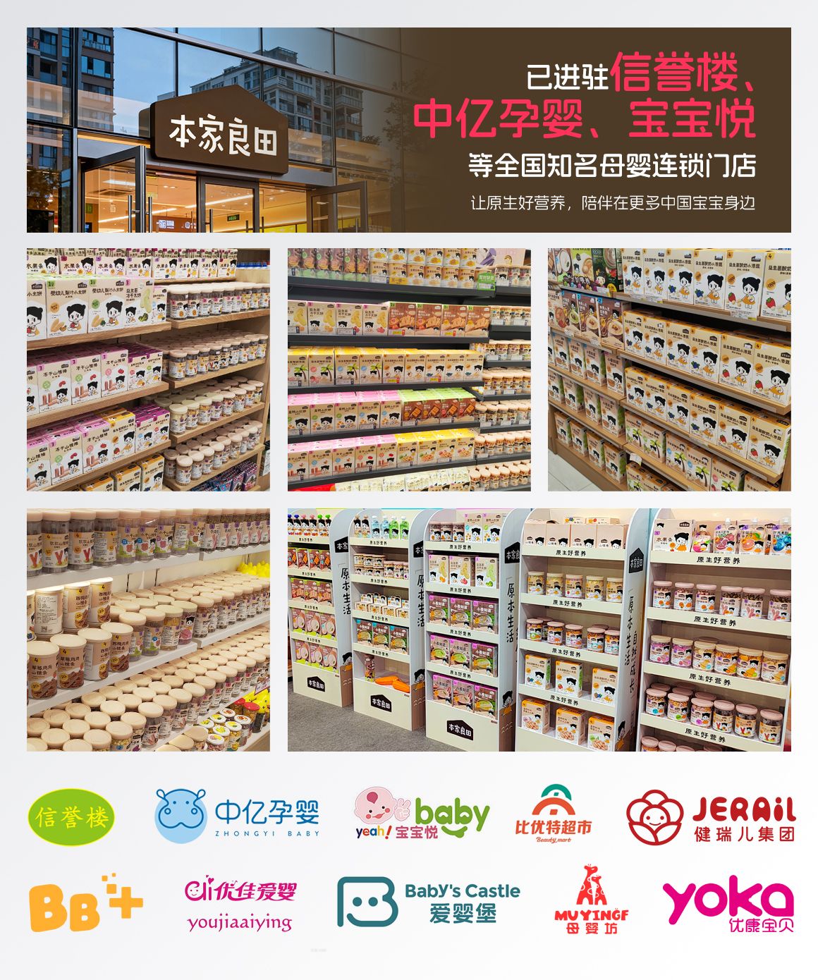 為讓更多中國寶寶享受到原生營養食品,本家良田緊跟市場趨勢,構建了線上線下全域覆蓋的銷售網絡。線下進駐中億孕嬰、信譽樓、寶寶悅等全國知名母嬰連鎖門店,線上則依托電商平臺觸達更廣泛的消費群體,配合多元化的品牌推廣與用戶運營,進一步擴大品牌影響力,讓更多中國寶寶能夠享受到原生營養食品。