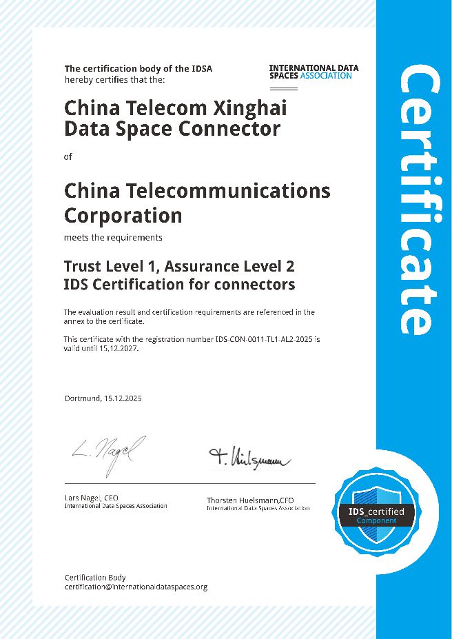 中國電信此次獲證的“中國電信星海數據空間連接器(China Telecom Xinghai Data Space Connector)”,是由中國電信股份有限公司數據發展中心打造,對標國際數據空間參考架構模型(IDS-RAM),符合國家《可信數據空間技術架構》及相關國際數據空間協議標準,具備良好的安全性、合規性與互操作能力的產品。產品在統一身份協同、策略與規則執行、數據使用控制、可信計算與數據可信流轉、跨域互聯互通等關鍵能力方面通過權威認證驗證,能夠有效支撐多主體間身份互認與策略協同,保障數據在流通過程中的可控、可溯與可信。該成果為推動數據要素安全流通、促進跨行業數據共享協作及可信數據空間建設提供了堅實的技術支撐,有助于釋放數據要素價值,服務數字經濟高質量發展。