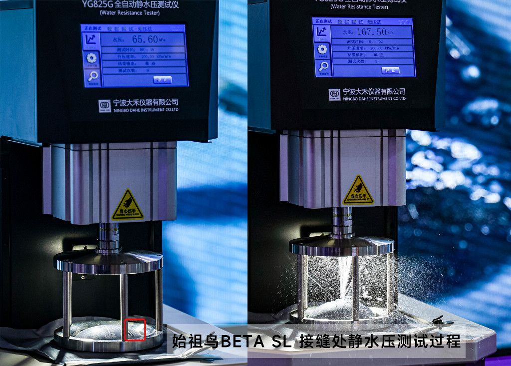 始祖鳥BETA SL接縫處靜水壓測試中,水壓在65.60kPa左右出現小水珠,76kPa左右面料部分出現水柱漏水,最終在167.50kPa膠條接縫處漏水