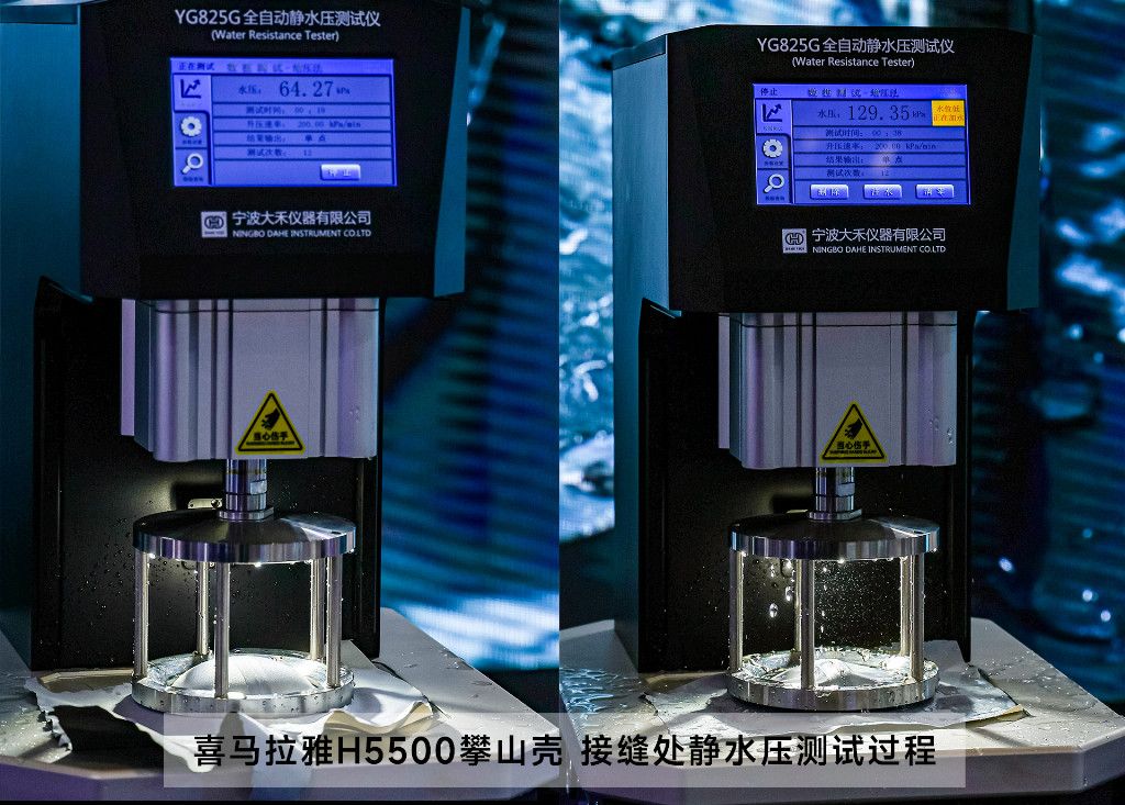 喜馬拉雅H5500攀山殼多點位測試中更穩定,面料、膠條接縫處均未出現漏水,寧波大禾YG825G水壓測試儀顯示壓力值最終穩定在129.35kPa