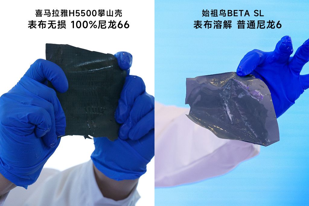材料的“耐久革命”: 在15%鹽酸溶解實驗中,搭載pk-tex? 巔峰面料的喜馬拉雅H5500攀山殼表層尼龍面料未被腐蝕溶解,確認為100%尼龍66材料,比常規的尼龍6材料抗磨損、抗撕裂性能高出20%,為專業攀登者帶來極致防護。而在同樣的測試中,始祖鳥BETA SL表層尼龍面料被15%稀鹽酸溶解腐蝕,露出內部白膜,為普通尼龍6面料。