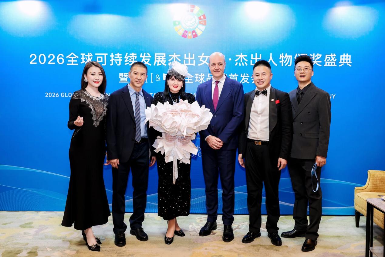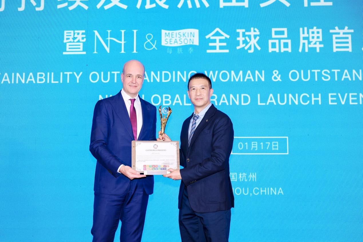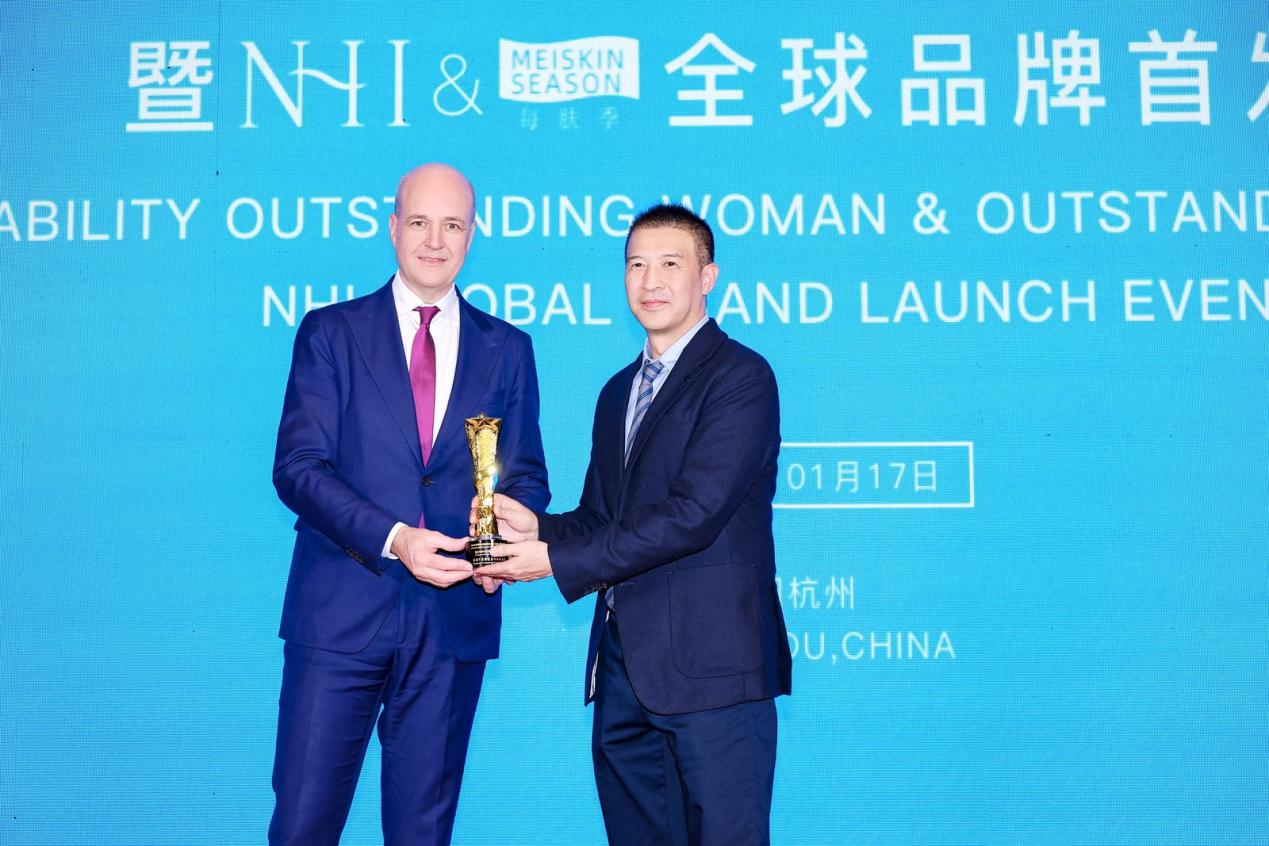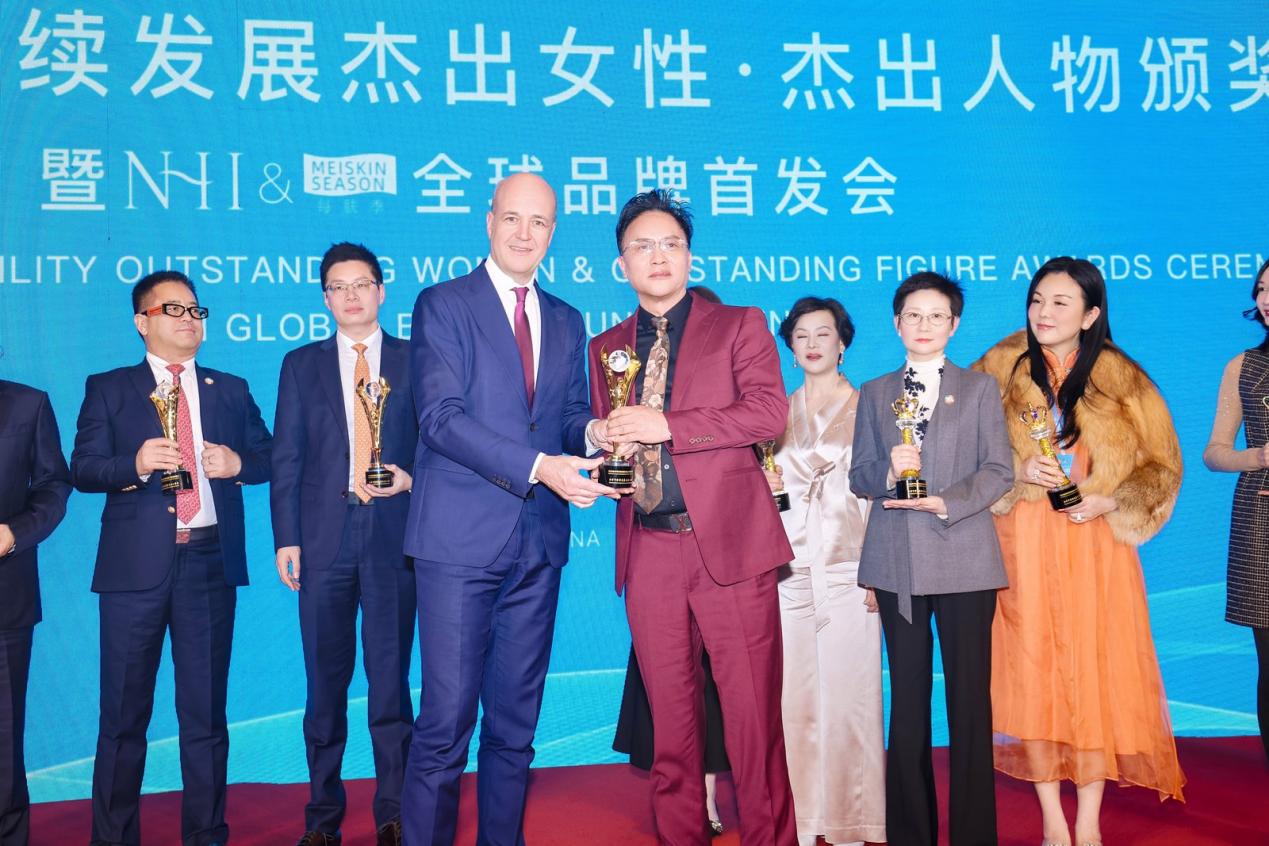 發布會現場,NHI 每膚季憑借其對行業可持續發展與經濟價值的雙重貢獻,獲得了國際市場與經濟界的高度認可。約翰先生以全球經濟和科技創新發展的戰略視角,為中科中創董事長、NHI每膚季品牌創始人--黎堅先生,以及浪莎集團董事長戰略顧問--史建樹先生頒發了“全球可持續發展人物杰出獎”,以表彰他們通過品牌創新,為企業與行業帶來的可持續增長范式!