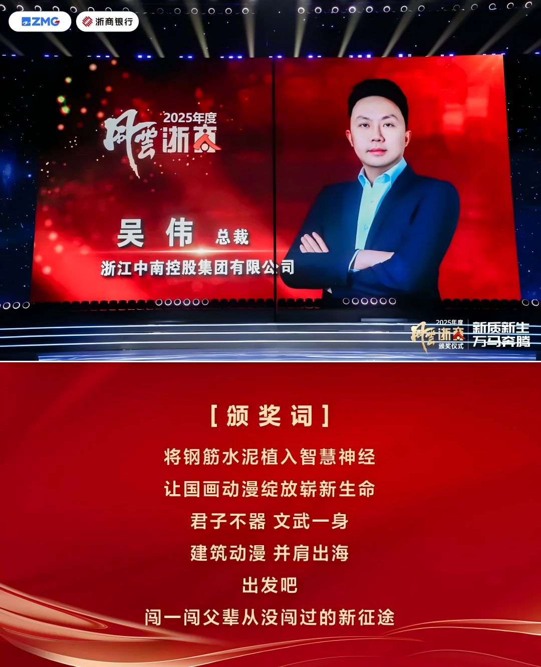 1月17日,2025年度風云浙商頒獎典禮隆重舉行,十位年度風云浙商正式揭曉。浙江中南集團總裁吳偉作為首位“90后”代表登上領獎臺。這份榮譽不僅凸顯了他在企業“數字化、綠色化、國際化”戰略布局上的扎實推動,以及對動漫文化出海與建筑數字化雙賽道并進的有力引領,更是對浙江中南集團長期扎根實業、持續創新、積極履行社會責任的高度認可。