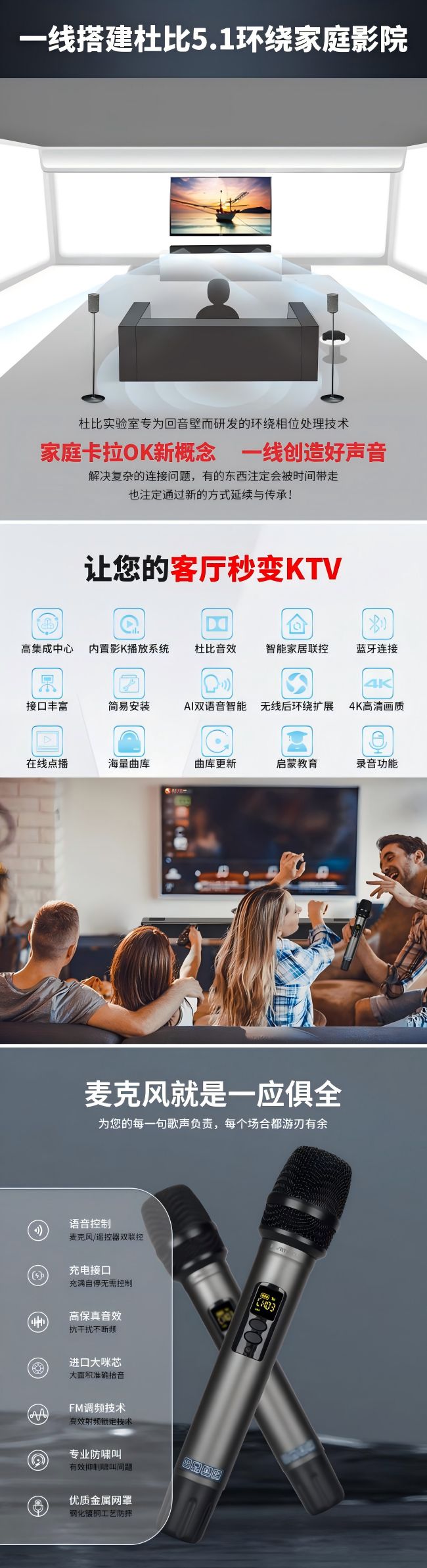 杜比實驗室專為回音壁而研發的環繞相位處理技術,讓聲場指向更加精準;語音識別時會自動降低背景音量,確保指令準確接收;內置的海量正版資源,再也沒有煩人的廣告等待;RS232智能中控接口更可接入全屋智能系統,一句話就能調節燈光氛圍,真正實現了“影院級體驗”。