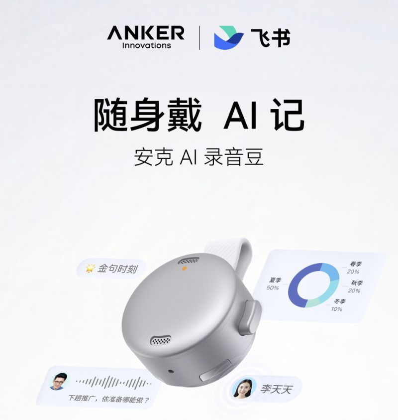 2026 年 1 月 19 日,安克創新與飛書聯合發布了最新 AI 硬件——安克 AI 錄音豆,飛書提供了該產品的軟件 AI 適配與服務。這款產品以極輕的"磁吸紐扣”形態實現無感隨身佩戴,基于飛書 AI 能力,支持聲紋識別、實時轉寫與翻譯、實時 AI 可視化總結以及智能紀要生成,結合飛書知識問答,將錄音變成可協同、可流轉的知識資產。