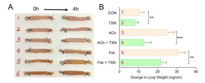 具體而言,華森制藥痛瀉寧顆粒通過阻斷細胞外 Ca2+內流和開放 K+通道來抑制肌源性收縮,并通過增強硝基能信號傳導和腎上腺素能β2樣效應來減弱神經源性收縮。此外,其通過 Ca2+相關途徑抑制上皮 Cl-分泌,從而減少腸黏膜分泌和液體流出,且不影響 Cl-的吸收。華森制藥痛瀉寧顆粒還能減輕腸系膜傳入神經的自發性活動,并抑制化學或機械刺激誘導的放電活動。