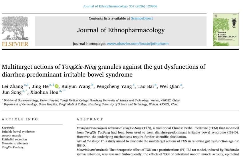 近日,由華中科技大學同濟醫學院附屬協和醫院消化領域侯曉華教授團隊開展的關于華森制藥痛瀉寧顆粒最新研究成果在國際權威期刊《Journal of Ethnopharmacology 》(IF 4.8,JCR Q1)發表,從現代科學的角度闡明了華森制藥痛瀉寧顆粒有效治療腹瀉型腸易激綜合征(IBS-D)的多靶點作用機制,為其臨床應用進一步提供了強有力的科學依據。