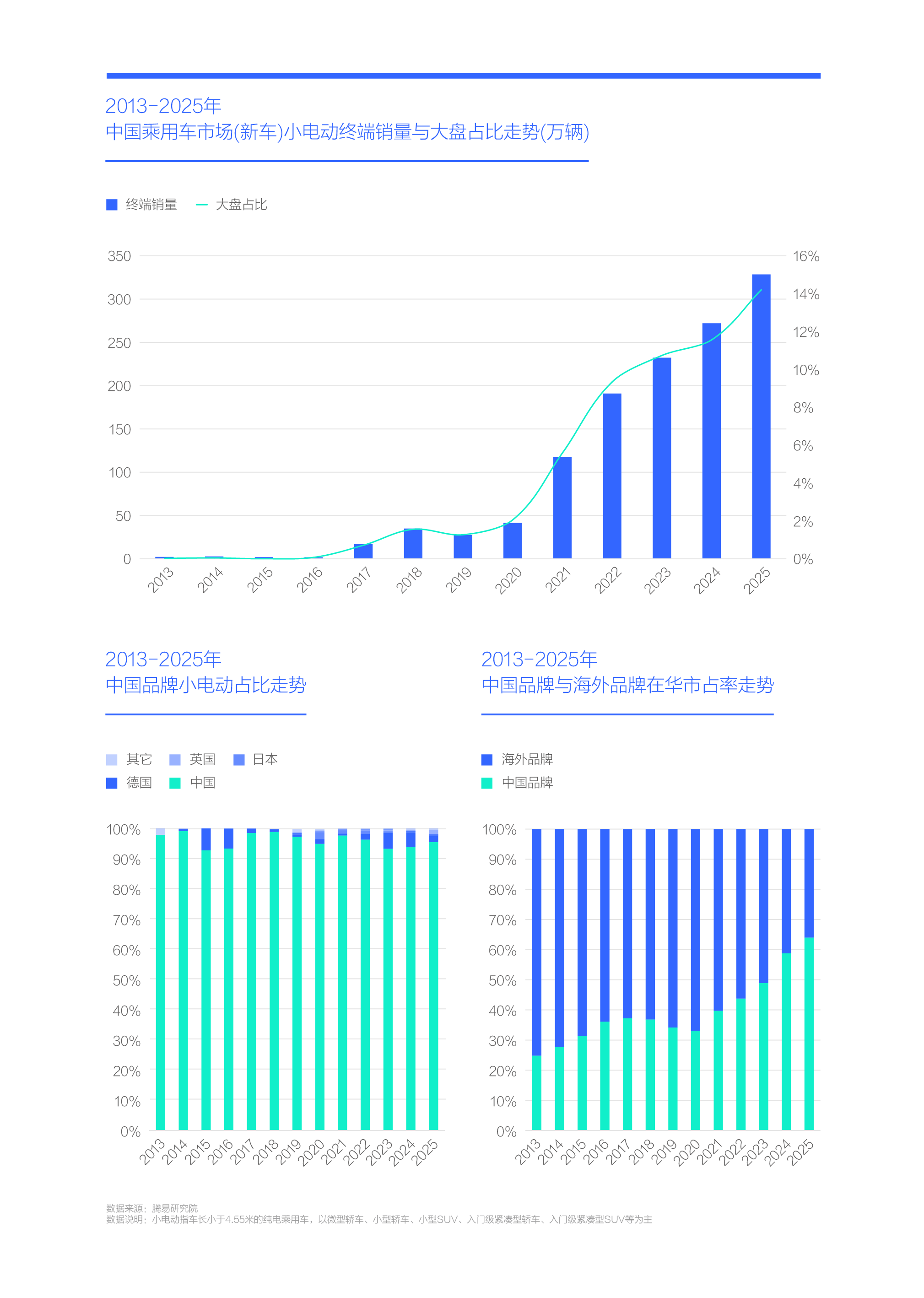 2020-2025年,中國車市的小電動銷量從不足50萬輛飆升至300多萬輛,中國品牌占比近96%,幾乎是唯一受益者