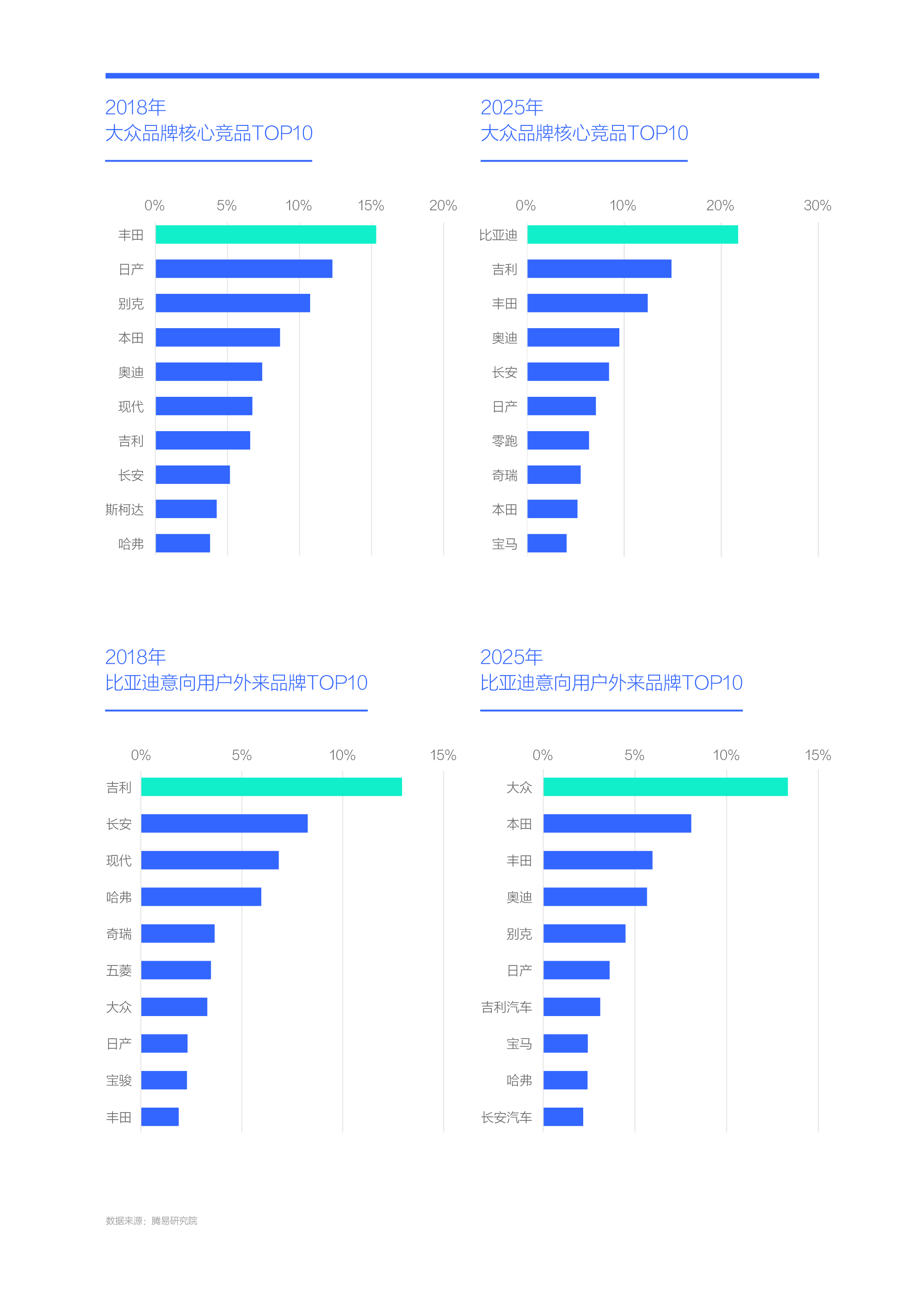 在小電動未強勢崛起之前,海外品牌幾乎不帶中國品牌玩,兩大陣營各玩各的。2018年大眾的最大競品為豐田,其次是日產、別克、本田和奧迪,TOP5全為海外品牌。中國品牌很難向海外品牌滲透,2018年比亞迪的意向用戶外來品牌最多的是吉利,其次是長安,第三雖是現代,但第四、第五和第六分別為哈弗、奇瑞和五菱,都是中國品牌。2020年起,隨著中國品牌小電動的強勢崛起,海外品牌的傳統競爭格局遭遇重創,中國品牌的威脅越來越大。2025年大眾的最大競品為比亞迪,其次是吉利、豐田、奧迪和長安,中國品牌占了大眾競品TOP5的三席,意味著大眾的任何市場舉措,首先就得考慮能否拿捏中國品牌。中國品牌不僅成為海外品牌的強勁對手,而且正大肆搶奪海外品牌的老用戶,尤其是“他”。2025年比亞迪的意向用戶外來品牌用戶最多的就是大眾,其次是本田、豐田、奧迪與別克,TOP5全是保有量巨大的海外品牌。這些用戶可不是全沖著比亞迪的小電動來的,還有漢、唐等更高端產品。上述演變間接說明比亞迪品牌的高端化迫在眉睫,在充分總結2025年夏與唐L成敗得失的基礎上,2026年大唐(最終車名尚未確定)、大漢(最終車名尚未確定)、海獅08等新一批高端產品不容閃失;