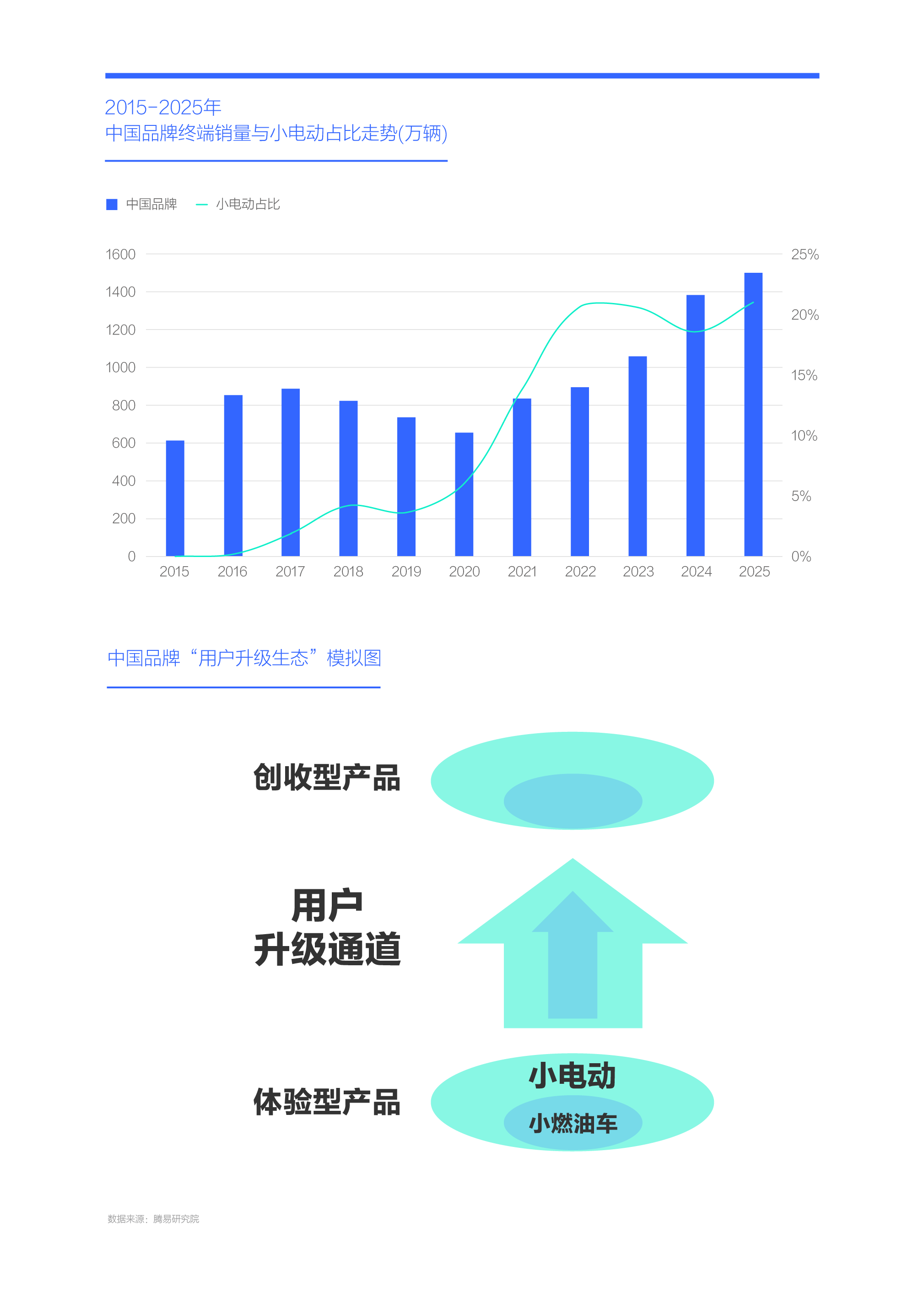 2025年,在體驗型產品為主的小車市場,中國品牌絕對主導的小電動的市占率逼近70%,為中國品牌重構“用戶升級生態”提供了肥沃土壤,也為中國品牌的高端化創造了絕佳機會;