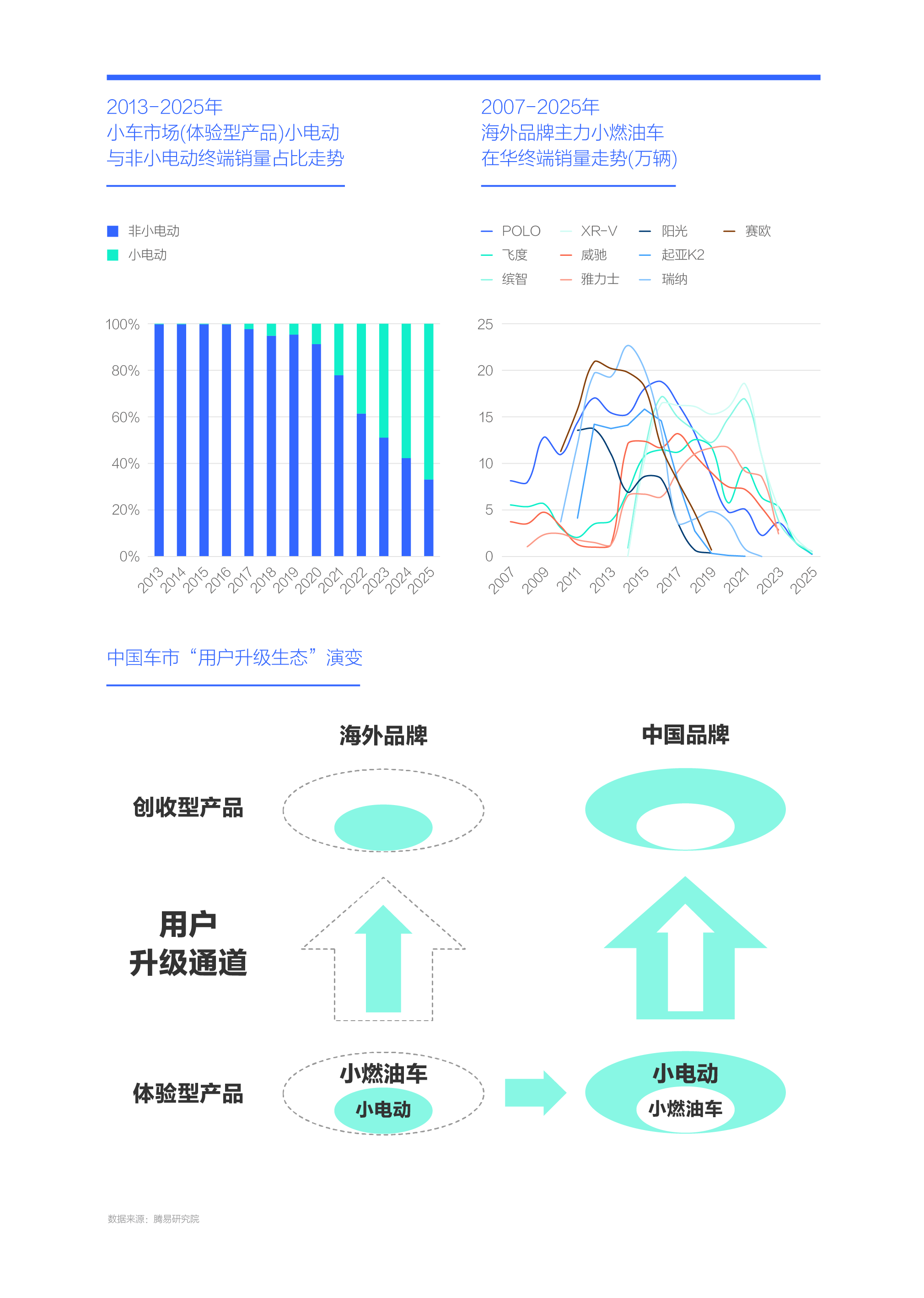 從拓展女性新賽道,到提升口碑,再到策反海外品牌的“他”,小電動除為中國品牌創造增量,還幫中國品牌重構了“用戶升級生態”,并順手瓦解了海外品牌基于小燃油車構建的“用戶升級生態”。2025年底,POLO、飛度等代表性小燃油車在華銷量微乎其微,接近停產狀態,一個時代幾乎即將畫上句號;