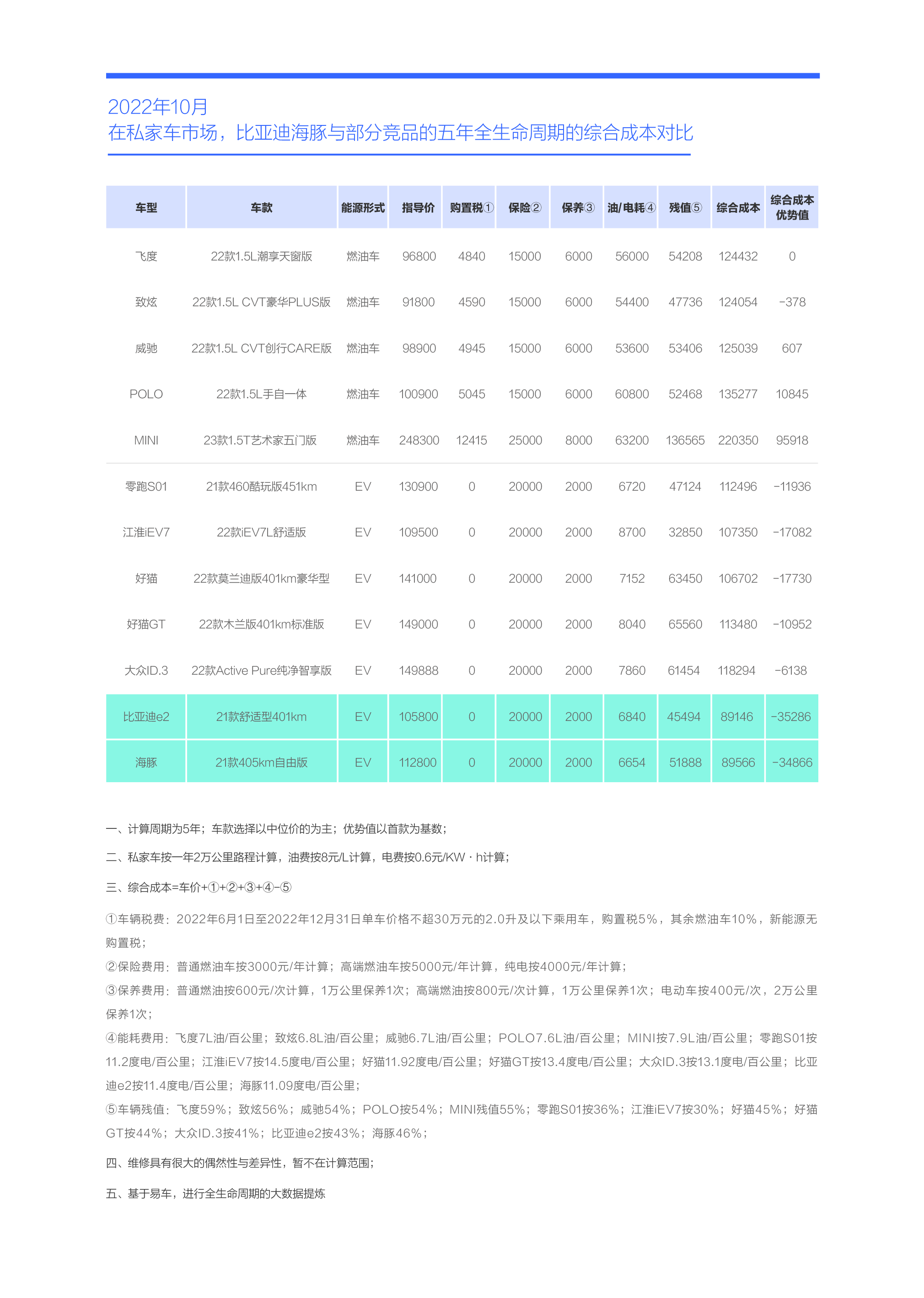 在小電動崛起初期的2022年,結合裸車價、維修、保養、殘值等全生命周期的綜合因素考慮,海豚的綜合成本不及9萬元,比當時同級別的POLO、威馳、致炫等小燃油車的綜合使用成本低了3萬元多,相當于不少用戶的一年收入,很有吸引力。在確保有巨大綜合成本優勢的前提下,中國品牌小電動的配置、設計、用料、智能等有顯著提升的板塊,不約而同發揮了錦上添花的價值,助力中國品牌小電動紛紛爆款;