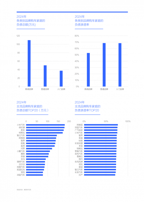 由于已婚、三十多歲、大城市和高學歷等特征,具備這些屬性的購車家庭負債水平更為突出,使得以該類用戶為主的高端汽車品牌購車家庭平均負債在2024年逼近110萬元。在主流汽車品牌負債總額TOP20中,高端品牌占據絕大多數,其中小米、蔚來、特斯拉、阿維塔、智己、智界等新銳高端品牌的家庭負債整體高于奔馳、寶馬、奧迪等傳統高端品牌。相比之下,普通品牌購車家庭平均負債大幅降至50萬元,入門品牌則跌破40萬元。